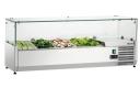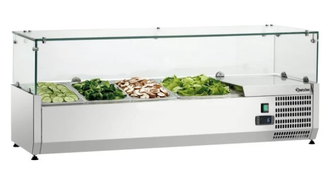 Opzetvitrine met statische koeling, voor garnituren, geschikt voor GN-Bakken 3 x 1/3 + 1 x 1/2 GN. De vitrine is voorzien van een elektronische besturing. De modellen zijn voorzien van een condensverdamper en een glazenopbouw als hoestruit. Inclusief verbindingsstukken