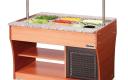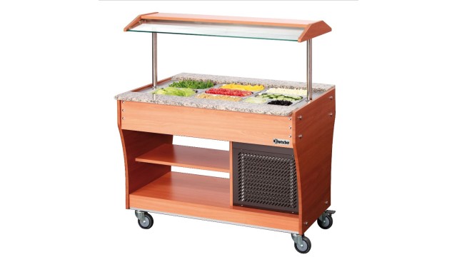 Verrijdbaar saladebuffet voor een uitmuntende presentatie van uw koude buffet. Het saladebuffet is voorzien van geïntegreerde verlichting, statische koeling, hoestscherm, opbergvak onder, en houten ombouw in walnoten kleur.