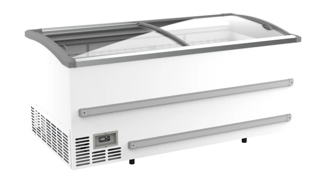 Bedrijfsklare commerciële, vrieseiland met statische koeling, analoog temperatuurregelaar, handmatige ontdooiing met glazen glijdeksels, hoogte bodem aanpasbaar.