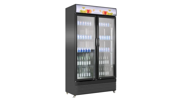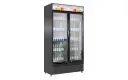 Combisteel BEZ-780 GD glasdeur koelkast zwarte binnenkant en zwarte buitenkant, met wielen en LED verlichting.