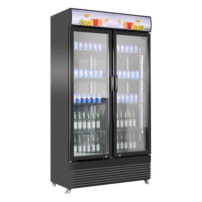 Combisteel BEZ-780 GD glasdeur koelkast zwarte binnenkant en zwarte buitenkant, met wielen en LED verlichting.