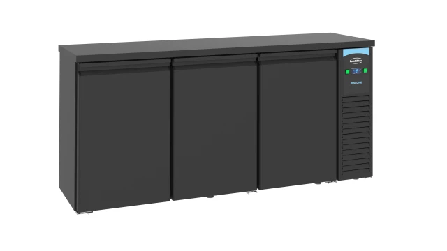 Een kwaliteit barkoeler met 3 blinde klapdeuren. Voorzien van automatische ontdooiing.