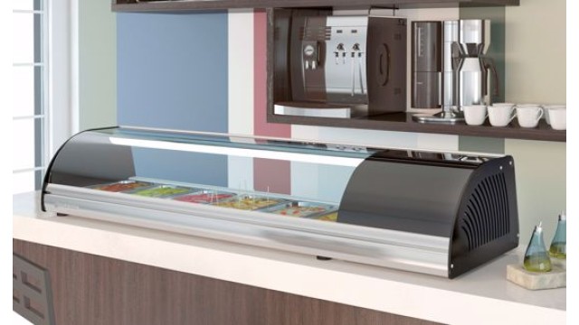 Coreco tapas opzetvitrine met een plaatkoeling, uit en inwendig is de vitrine van RVS AISI304 18/10 de meegeleverde bakken zijn 1/3 x 30 mm hoog.