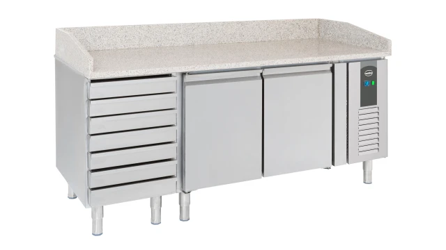 Combisteel 7950.0042 Grey Label Pizzawerkbank volledig uitgevoerd in RVS, geforceerde koeling, automatische ontdooiing, 2 deuren + 7 laden.