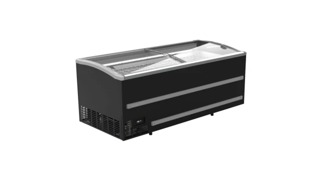 Bedrijfsklare commerciële, vrieseiland met statische koeling, analoog temperatuurregelaar, automatische ontdooiing met glazen glijdeksels,hoogte bodem aanpasbaar.