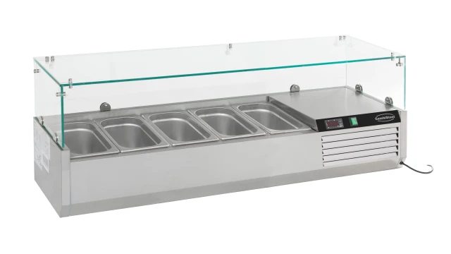 De gekoelde opzetvitrine is voor het bewaren van ingrediënten in gastronormbakken. Dit is bijvoorbeeld handig voor horecaondernemers die zich bezighouden met het verkopen van etenswaren als belegde broodjes. Door voor het opslaan en koelen van broodbeleg glazen opzetvitrines te gebruiken, kunnen de gasten in de betreffende horecazaak namelijk direct zien uit welke soorten broodbeleg men kan kiezen bij het kopen van een belegd broodje. De opzetvitrine is standaard voorzien van een glasopstand. De temperatuur is digitaal instelbaar. Wordt geleverd zonder GN-Bakken