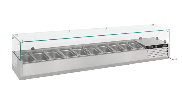 De gekoelde opzetvitrine is voor het bewaren van ingrediënten in gastronormbakken. Dit is bijvoorbeeld handig voor horecaondernemers die zich bezighouden met het verkopen van etenswaren als belegde broodjes, Door voor het opslaan en koelen van broodbeleg glazen opzetvitrines te gebruiken, kunnen de gasten in de betreffende horecazaak namelijk direct zien uit welke soorten broodbeleg men kan kiezen bij het kopen van een belegd broodje. De opzetvitrine is standaard voorzien van een glasopstand. De temperatuur is digitaal instelbaar. Wordt geleverd zonder GN-Bakken