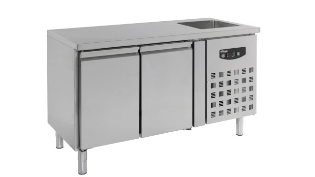 Een professionele gekoelde werkbank van Combisteel, geschikt voor  2 x GN 1/1 en ideaal voor keukens waar ruimte beperkt is. Hiermee creëert u extra werkoppervlak en extra opslag, deze werkbank is voorzien van een spoelbak. Met 2 roosters, gebruiksvriendelijke bediening, automatische ontdooiing en geforceerde koeling.
