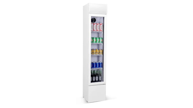 Combisteel 7455.1385 glasdeur koelkast Smal, statische koeling met ventilator, 4 roosters, en automatische ontdooiing.