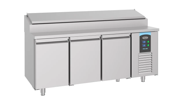 Combisteel 7489.5145 geforceerde saladette, met 50 mm isolatie, automatische ontdooiing, geschikt voor 10x 1/3 GN, omgevingstemperatuur +43ºC, inclusief 1 rooster 1/1 GN en geleiderset per deur en RVS deksel.