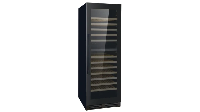 Zwarte gepoedercoat staal wijnkoelkast met 13 roosters geschikt voor 154 wijnflessen, LED verlichting, de deur is omkeerbaar.