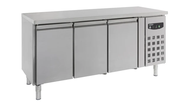 Een professionele gekoelde werkbank van Combisteel, geschikt voor GN 2x 1/1 en ideaal voor keukens waar ruimte beperkt is. Hiermee creëert u extra werkoppervlak en extra opslag. Met 3 verstelbare roosters, 3 bodemroosters, gebruiksvriendelijke bediening, automatische ontdooiing en geforceerde koeling