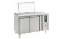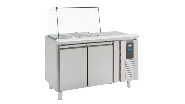 Combisteel saladette / koelwerkbank type Standard Line met geforceerde koeling, automatische ontdooiing, isolatie 60 mm, vast ingebouwde compressor, inclusief 1 rooster 1/1 GN en geleiderset per deur, geboden glasopzet, geschikt voor 2 of 3 1/1 GN inzet, exclusief bakken.
