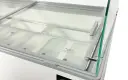Een eenvoudige maar doeltreffende vitrine. Door middel van de glazen schuifdeksels wordt de vrieskist geopend en gesloten