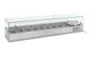 De gekoelde opzetvitrine is voor het bewaren van ingrediënten in gastronormbakken. Dit is bijvoorbeeld handig voor horecaondernemers die zich bezighouden met het verkopen van etenswaren als belegde broodjes, Door voor het opslaan en koelen van broodbeleg glazen opzetvitrines te gebruiken, kunnen de gasten in de betreffende horecazaak namelijk direct zien uit welke soorten broodbeleg men kan kiezen bij het kopen van een belegd broodje. De opzetvitrine is standaard voorzien van een glasopstand. De temperatuur is digitaal instelbaar. Wordt geleverd zonder GN-Bakken