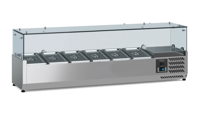 Deze professionele Eco Frost budget line salade opzetvitrine is geschikt voor intensief gebruik en heeft 60 mm energiebesparende isolatie.