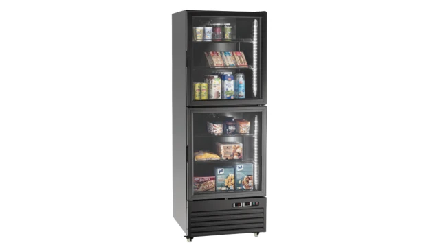 Deze professionele combinatie van koelkast en vrieskast verenigt functionaliteit en design in één apparaat. De luxe zwarte afwerking en de glazen deuren zorgen voor direct zicht op de inhoud, terwijl de afzonderlijk schakelbare LED-verlichting uw producten perfect presenteert.