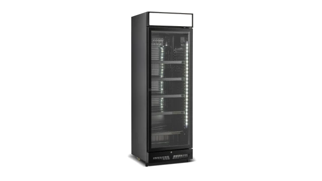 De SVE-450 BLC combineert strak design met maximale zichtbaarheid. Deze volledig zwarte glasdeurkoelkast met 1 deur is uitgerust met een opvallende lichtbak bovenop, waarmee je producten of branding direct in het oog springen. Dankzij het zwarte interieur en exterieur oogt hij modern en professioneel in elke horecazaak, winkel of showroom. De statische koeling houdt alles perfect op temperatuur, terwijl de energiezuinige LED-verlichting je producten helder presenteert. Met een inhoud van 400 liter, 5 verstelbare roosters, een zelfsluitende deur en een slot is hij zowel flexibel als veilig in gebruik.