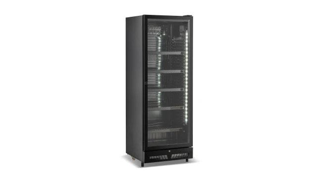 Deze volledig zwarte glasdeurkoelkast met 1 deur is dé perfecte combinatie van design en functionaliteit. Dankzij het moderne, zwarte ontwerp – zowel van binnen als van buiten – is dit model een echte eyecatcher in elke horecazaak, winkel of zelfs thuis. De statische koeling houdt je producten perfect op temperatuur, terwijl de ingebouwde LED-verlichting zorgt voor een heldere, aantrekkelijke presentatie. Met 400 liter inhoud en 5 verstelbare roosters heb je bovendien volop ruimte en flexibiliteit. De zelfsluitende deur en het slot zorgen voor extra gebruiksgemak en veiligheid. Afmetingen 650x595x1795 mm (BxDxH) – inhoud 400 liter – verbruik 0,23 kW – temperatuur +2/+10 °C – gewicht 65 kg.