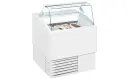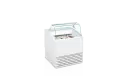 Verrijdbare statische schepijsvitrine met plexiglas kantelklep aan de achterzijde, en een vlakke schuine ruit aan de voorzijde.