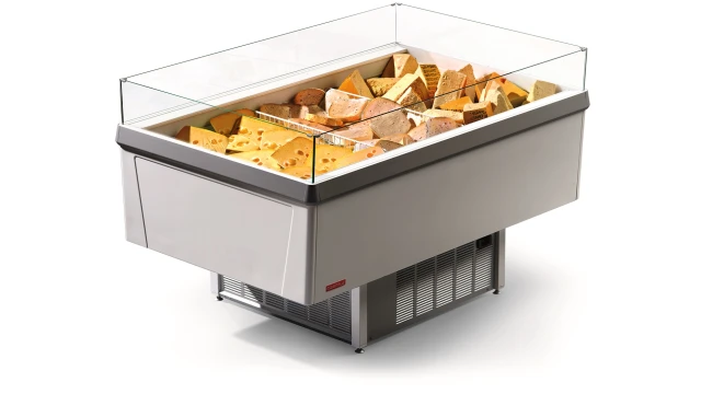 Het koeleiland Azimut van Oscartielle is uitermate geschikt voor de presentatie van zuivel, dranken en vleeswaren en heeft een temperatuurklasse van 3M1 en 3M2 bij de R290 uitvoering. Dankzij de 4 zijden met glas heeft het meubels optimale presentatie eigenschappen.
