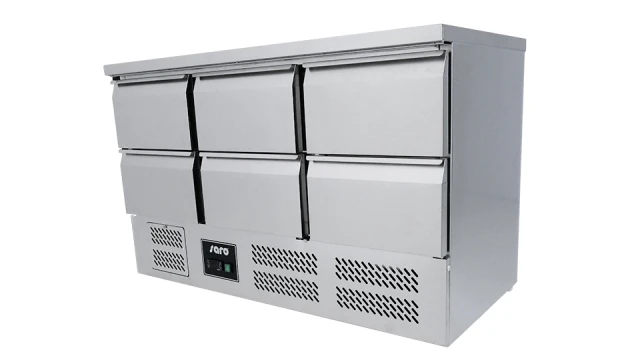 Een professionele gekoelde werkbank met 6 laden van Saro zijn ideaal voor keukens waar ruimte beperkt is. Hiermee creëert u extra werkoppervlak en extra opslag. Gebruiksvriendelijke digitale bediening, automatische ontdooiing en geforceerde koeling. De ruimtebesparende compressor is onderin geplaatst, eenvoudig te reinigen werkblad.