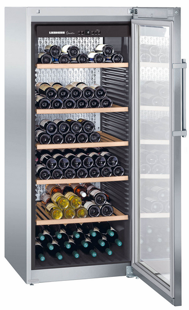 De Liebherr wijnbewaarkast WKes 4552 met UV gecoate isolatie glasdeur is rondom uitgevoerd in edelstaal. GrandCru model met verstelbare houten legplateaus, digitale temperatuurmeter, apart schakelbare LED verlichting, temperatuur- en deuralarm. Capaciteit 201 flessen (Bordeauxformaat).