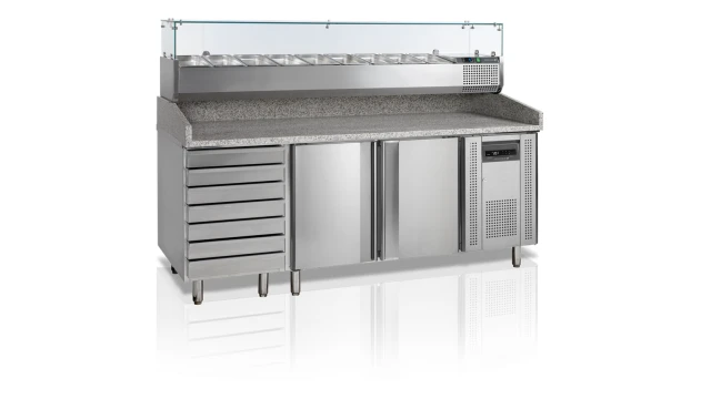 Tefcold PT1310 + VK38-200 pizza werkstation voorzien van laden en deuren en een granieten werkblad.