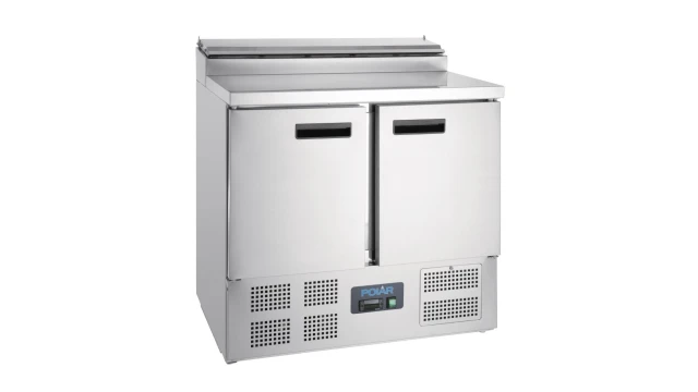 Een hoge kwaliteit, 2-deurs, RVS gekoelde professionele horeca prepareer counter van Polar. Met gebruiksvriendelijke bediening, digitaal display, geventileerde koeling en automatische ontdooiing.