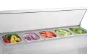 - Kan gebruikt worden met 5x GN 1/6 bakken van 150mm diep (bakken worden apart verkocht) en wordt geleverd met 2 verstelbare roosters en 2 bodemroosters.