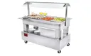 Onderstel "doorgeefversie", opslagruimte voor borden en bestek, schappen in geborsteld roestvrij staal met afneembare bovenstructuur (voor specerijen of borden tot 190mm). Hoestscherm van "gehard" glas, met aan elke kant LED-verlichting.