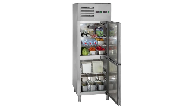 Geforceerde bedrijfskoelkast van buiten en binnen roestvrij staal AISI 304 met zelfsluitende deur en automatische ontdooiing.