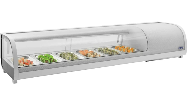 De Saro sushi vitrine is voorzien van een hoogrendement compressor en een dubbele verdamper. De gebogen ruit geeft een maximaal zicht op de uit te stallen producten. Uiteraard is deze opzetvitrine ook geschikt voor andere voedselproducten producten.