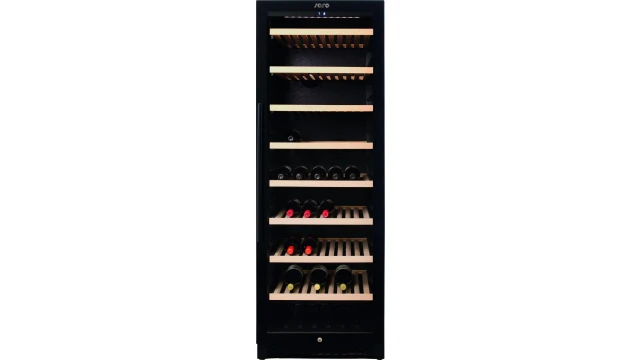 Saro wijnkast WKS 162 materiaal buiten gepoedercoat staal, binnenkant van kunststof zwart, 8 verstelbare houten roosters, interne LED wit verlichting aan de bovenkant, analoge thermometer, dubbel glasdeur met touch screen, 2 transport rolletjes aan de achterkant.