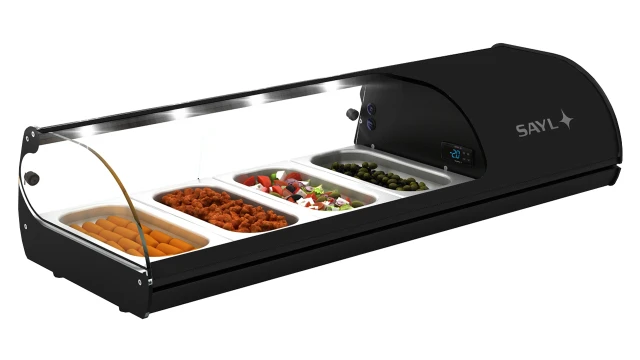 Moderne en elegante opzet koelvitrine uit de stal van Sayl. Een kwaliteits-vitrine uit Spanje. Met presentatie mogelijkheden op 1 niveau van koude gerechten. De geharde glazen ombouw is voorzien van zuinige LED verlichting. Aan de achterzijde voorzien van schuifdeuren en een digitale temperatuur uitlezing. FCKW vrij en voorzien van een geventileerde condensor.