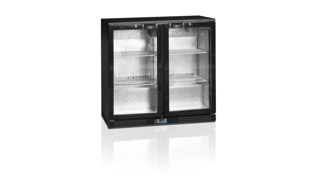 De DB-serie backbars wordt geleverd met 1, 2 of 3 deuren met dubbel gehard glas. Kies tussen schuifdeuren of draaideuren. De backbar heeft een zwarte buitenzijde, een stucco aluminium interieur en wit geplastificeerde draadplanken voor eenvoudig onderhoud.