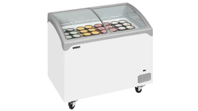 Elegante diepvrieskist met gebogen glazen schuifdeksels