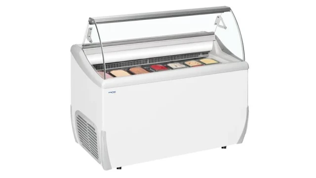 De vriezer is uitgerust met glazen schuifdeksels, die niet alleen zorgen voor een stijlvolle uitstraling, maar ook bijdragen aan een goede isolatie en energiebesparing wanneer het ijs niet wordt geserveerd via de schuine glazen afscherming.
