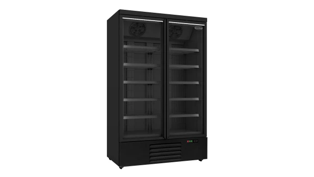 Combisteel JDE 1000F glasdeur koelkast zwarte binnenkant en zwarte buitenkant, met wielen en LED verlichting.